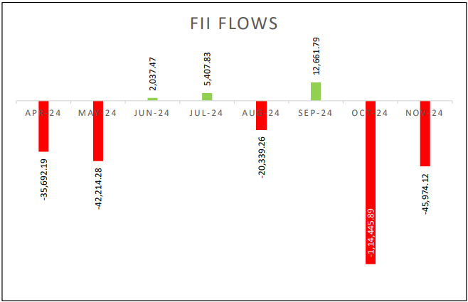 3. Strong FII Outflows – Foreign Institutional Investors (FIIs) have been significant sellers in the cash market, contributing heavily to the correction. As of November 30, 2024, total FII outflows for FY 2025 exceeded ₹2 trillion. To put this into perspective, the combined selling in October and November alone is more than double the net outflows recorded between April to September. This large-scale selling has increased pressure on the markets, leading to further declines.