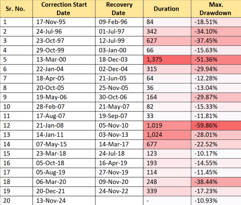 Note: Correction Start Date marks when Nifty fell over 10% from its peak, and Recovery Date is when it reclaimed the peak, based on closing prices.